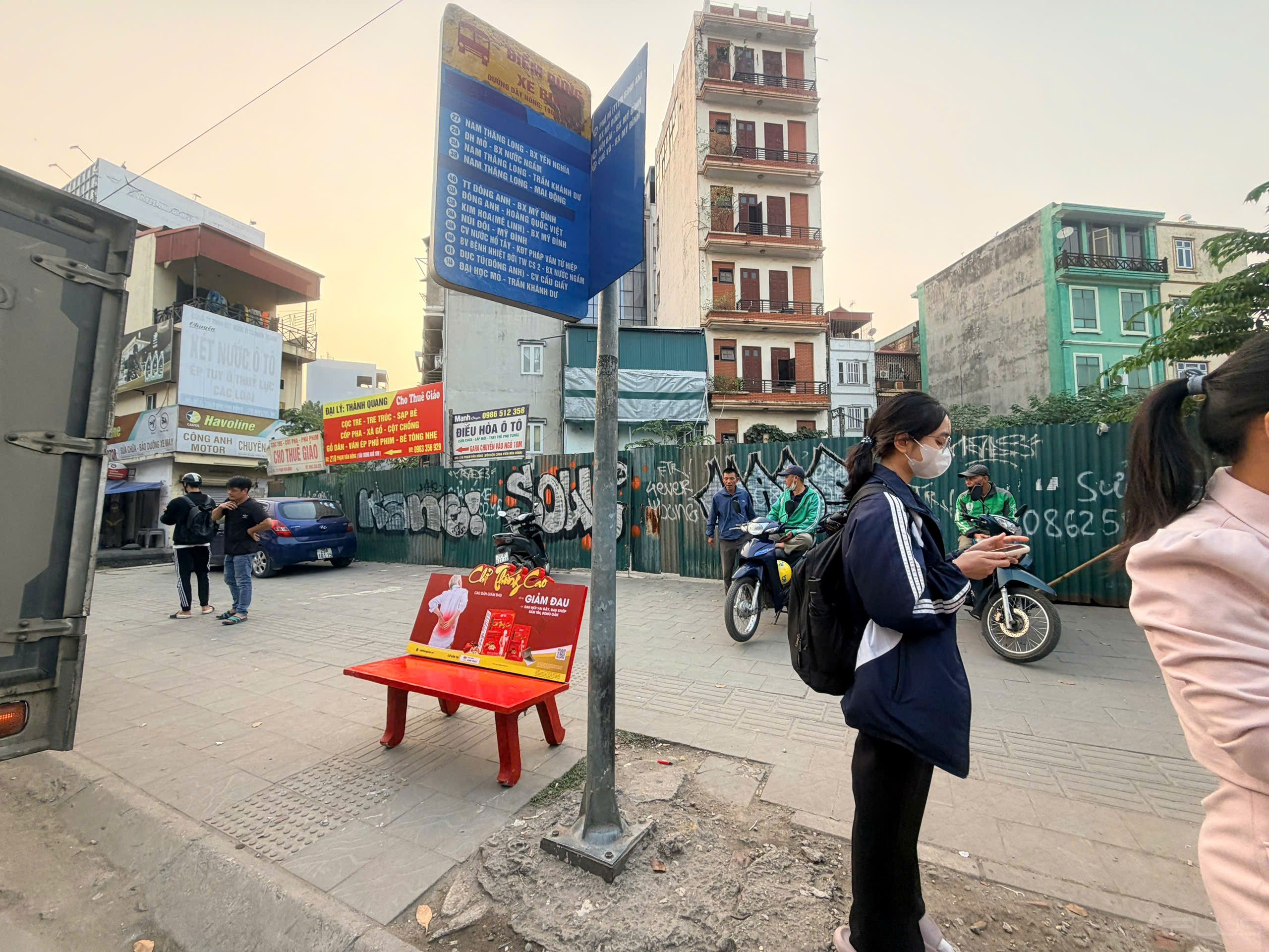 Gần điểm chờ xe buýt, nút giao thông, trục đường đông xe máy.